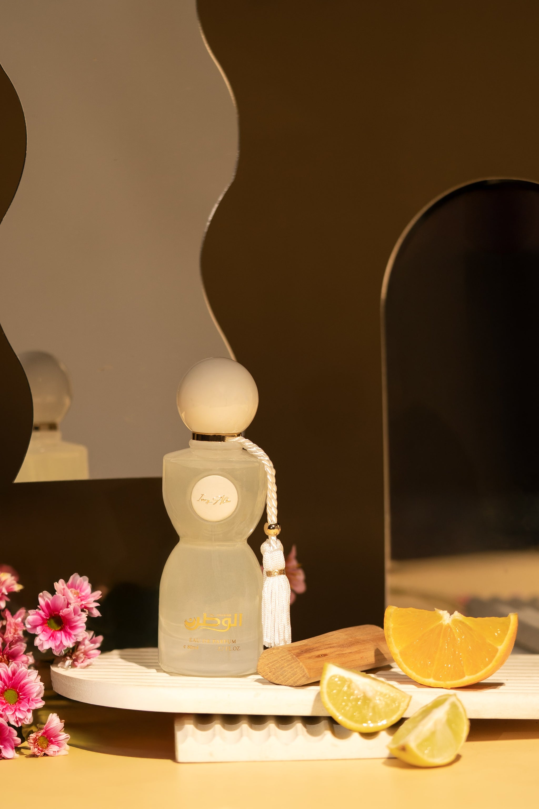 A luminous cascade of citrus and white flowers. Capturing morning light through crystal.